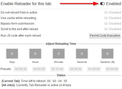 - Is there a minimum time period for tab reloading?Currently, the minimum acceptable time period is 10 seconds. This might be changed in the future to make sure the count down starts after tab’s is fully loaded to prevent unnecessary reloads.